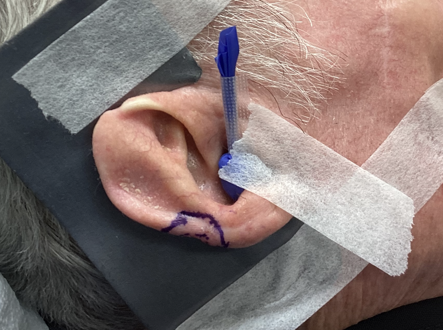 Patient at his first radiation visit where the cancer was identified and proper margins were drawn.