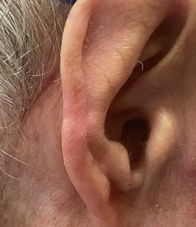 Right ear at 8-week follow-up showing a well-healed area with no sign of recurrence.